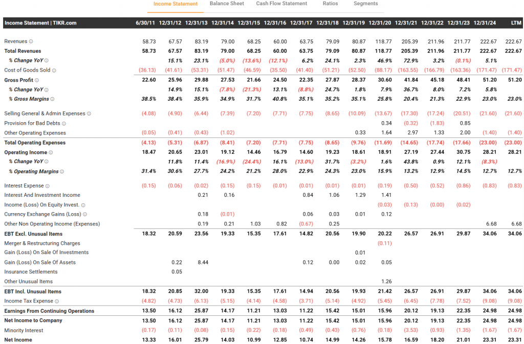 More importantly, in 2020 the company made an acquisition of 70% of MTL Engineering (MTL). The purchase price was 23.8m, which is a meaningful amount for this company. The purchase included a cash balance of 6.9m, so the net cash outflow for the acquisition was 16.9m. As noted above, MTL comprises the company’s Metal Stamping segment. The acquisition seems to have worked out reasonably: I think the profit for MTL was 2.92m in 2024 and 3.13m in 2023. The disclosure for the results of the subsidiaries can be found on page 84-87 in the 2024 annual report. I took the profit for MTL (“MTLSB”), disclosed on pages 86 and 87, and subtracted the portion allocated to the non-controlling interest, disclosed on pages 85 and 86. There are also segment profit numbers on page 109, but I think those numbers include the minority interest and there might be some other charges excluded in that number as well.
